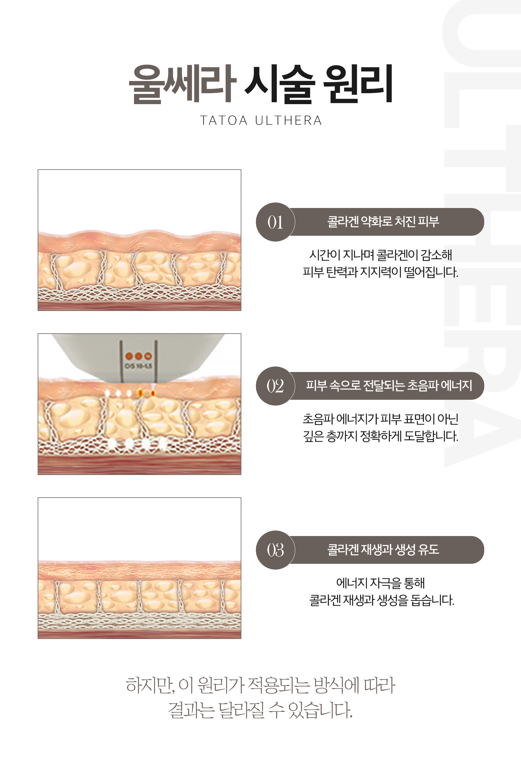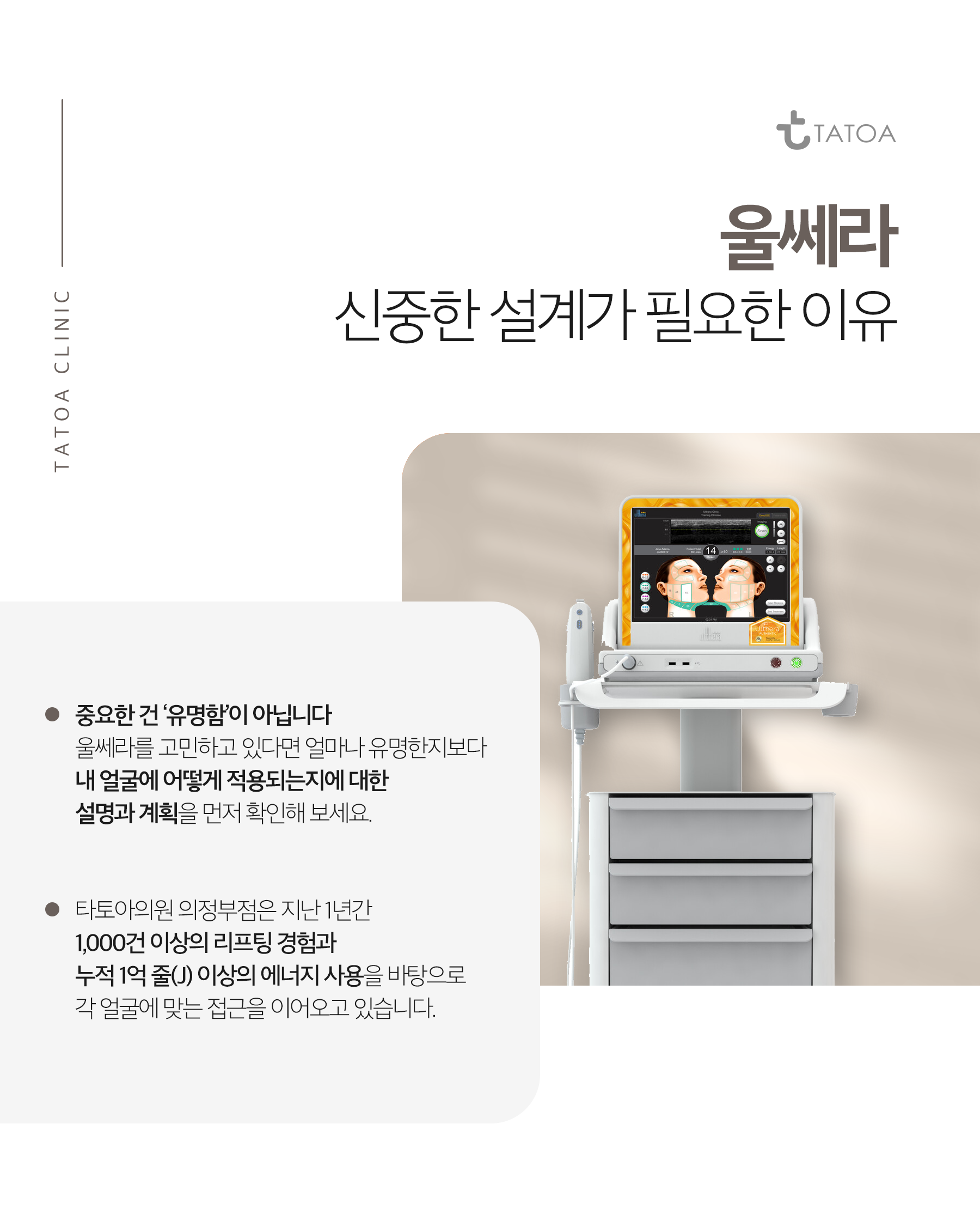 안녕하세요, 타토아의원 의정부점입니다. 울쎄라 시술에 대해 이야기하다 보면 짧은 시간 안에 얼굴 인상이 달라질 것 같고, 한 번의 시술만으로도 확실한 변화를 기대해도 될 것처럼 느끼시는 분들이 많습니다. 실제로 온라인이나 SNS에서는 한 번 받아보면 알게 된다는 표현으로 울쎄라가 자주 언급되기도 합니다. 물론 이런 기대가 전혀 근거 없는 이야기는 아니지만, 그 한 문장만으로 울쎄라라는 시술을 모두 이해하기에는 현실은 조금 더 복합적인 면이 있습니다.